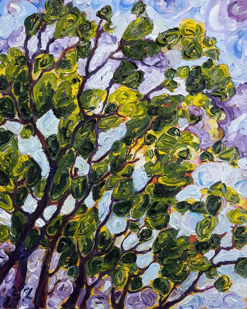 I really like to look at the sky through the branches of trees. The color of the sky is then seen as especially beautiful, and the enlightened leaves sway from the light breeze that walks in the branches as if playing with them. 2021 Oil on Canvas panel. 9x11in