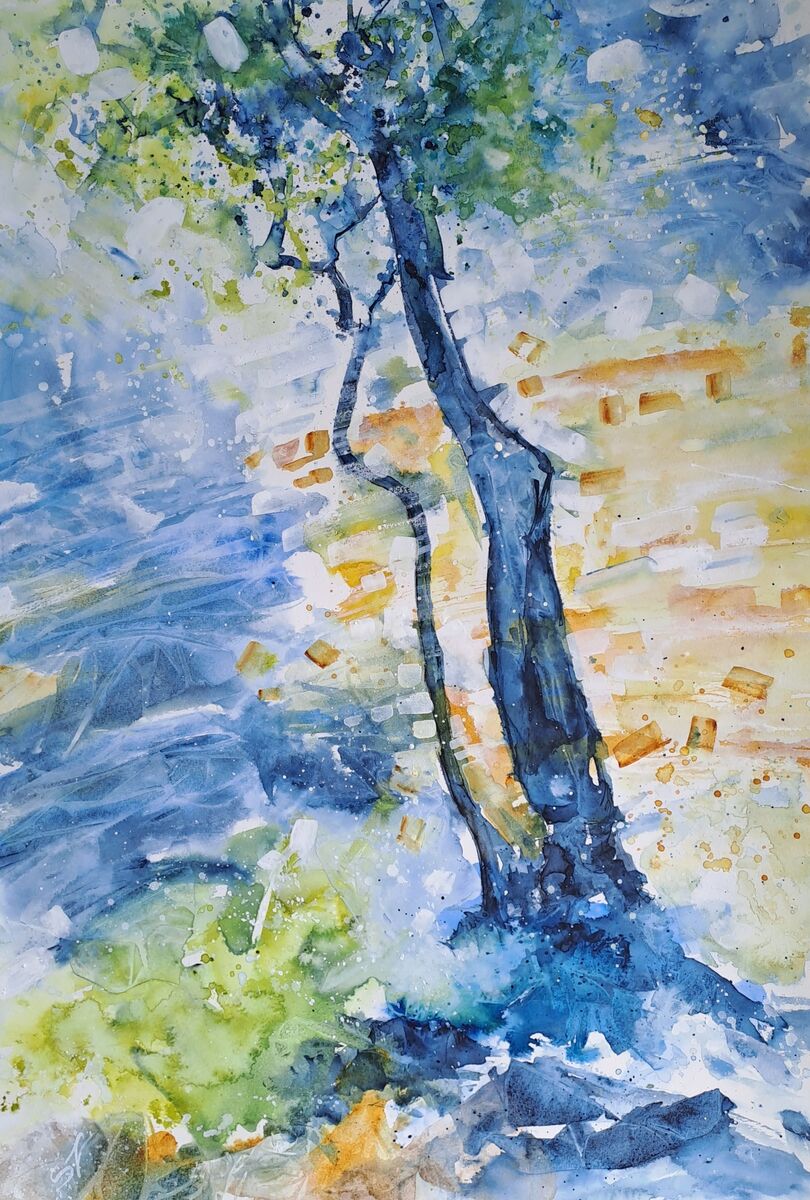 I saw these magical trees while traveling to Wentworth Falls (Blue Mountains, Australia) on the way to the bottom of the falls. It was impressive. They shine in the sun's rays looking into the canyon. 15x22in (37.5x58cm). Watercolor, created on watercolor paper 300g/m2 100%cotton. Signed on the back. Unframed.